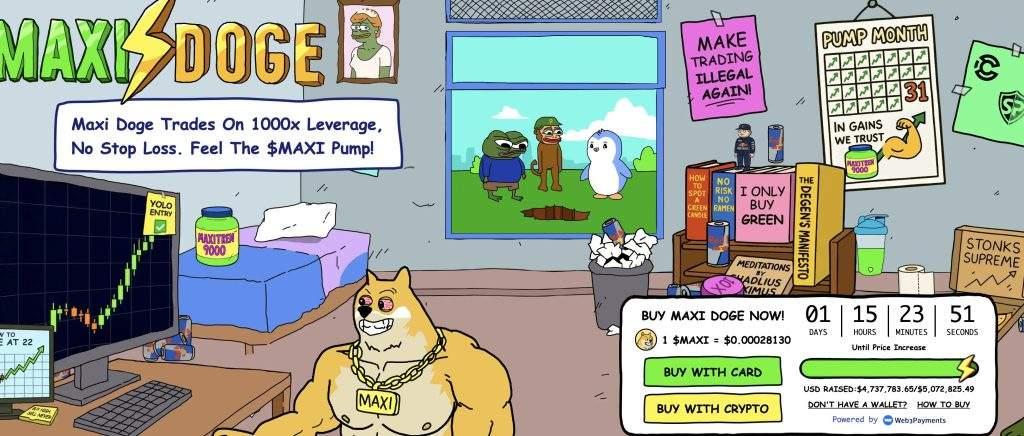 Maxi Doge (MAXI) It is an ERC-20 meme token built around a strong and powerful identity: a large 240-pound dog that combines the logic of trading with 1000x leverage.