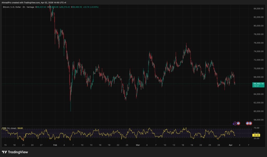 Bitcoin is currently sitting at $66,500, stuck in a downward trend since the March peak at $76,000, as any attempt to recover weakens and sells to stop any pressure before it starts to rise.
