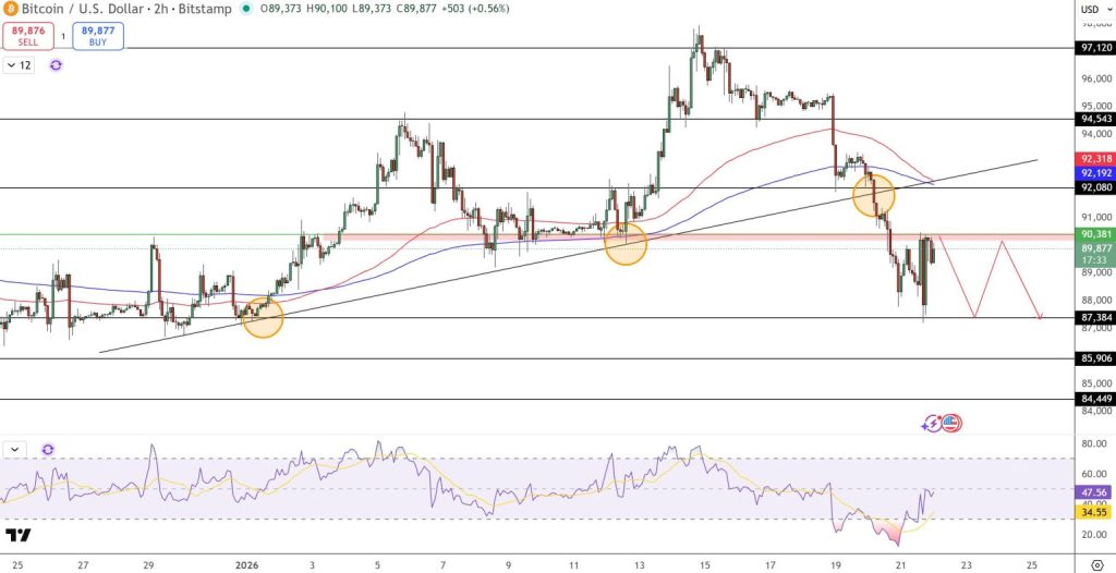 Expectations indicate a fall in the price of Bitcoin, as it is currently trading near $89,800 after recovering from the level of $92,000 to $93,000. On the 2-hour chart, the price has fallen below the January uptrend line, indicating a clear loss and not just a temporary rebound. Strong bearish candles have supported selling, while small bearish candles indicate continued selling as buyers hesitate.