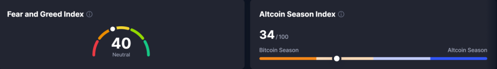 The Fear and Greed Index of 40 indicates a neutral, lack of confidence, and the Altcoin Season Index of 34/100 confirms that the market is still dominated by Bitcoin rather than risk appetite. Bitcoin’s dominance was still based on the remaining funds by choice rather than speculation.