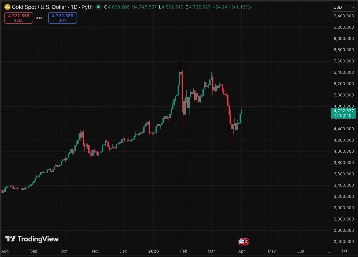 The current session has put gold near $4,700, up 1.5% on the day. This figure looks strong when viewed separately from the 13% pullback seen in March from the previous peak above $5,000.