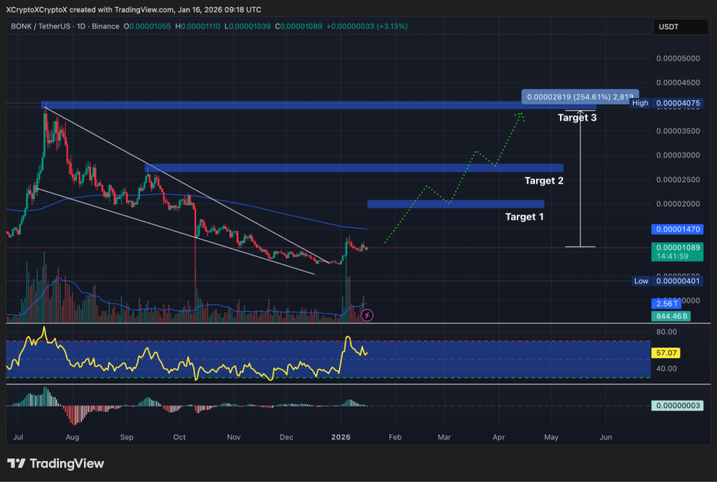 BONK USDT 1-Day Chart – Falling Wedge Breakout Strategy. Source: TradingView.